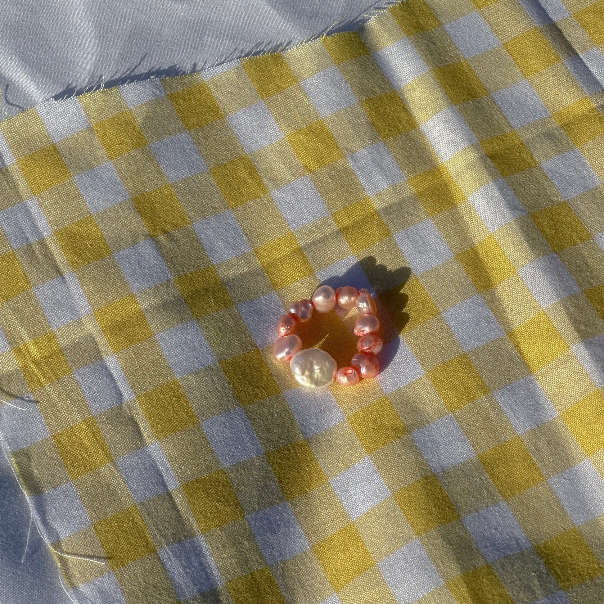 Elastic ring featuring pink dyed freshwater pearls and a flat coin pearl.